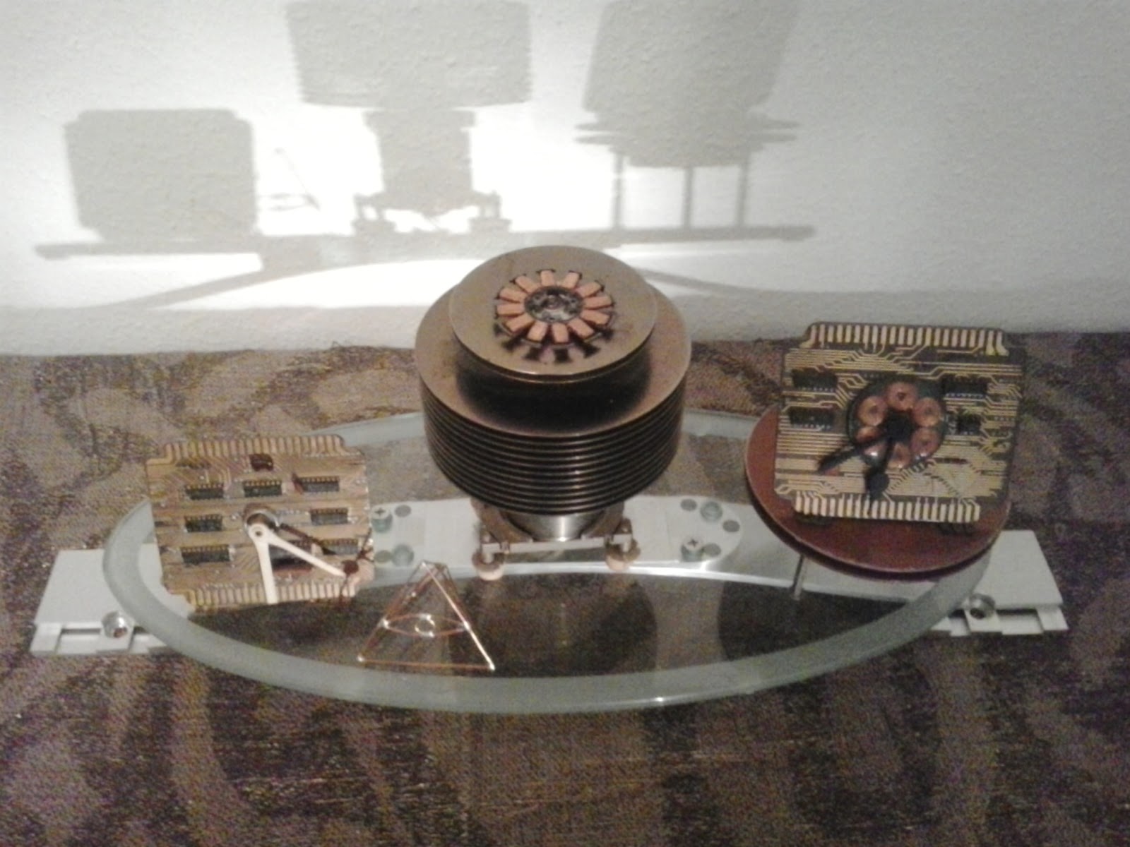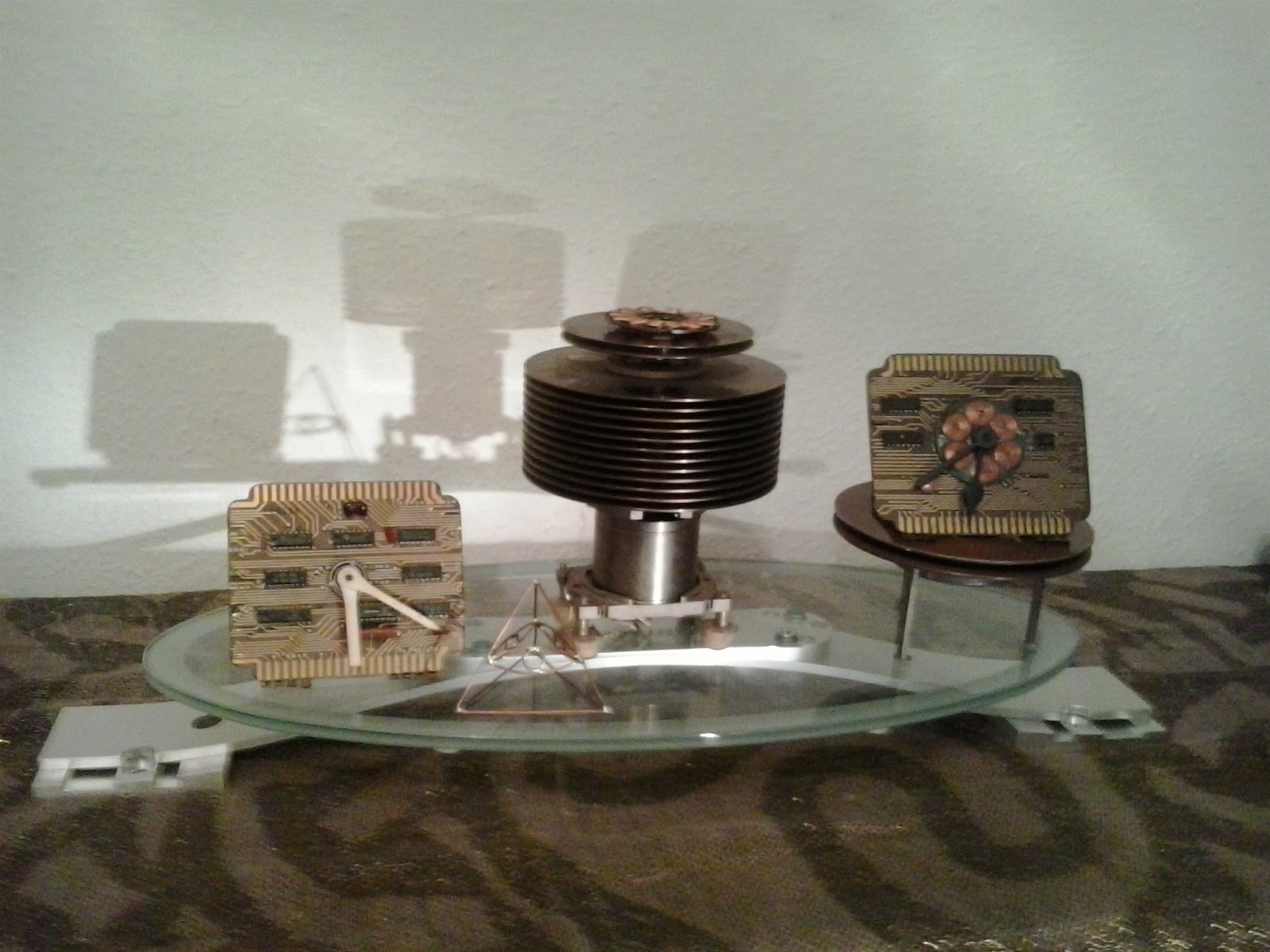 Kunstwerk aus alten Festplatten, - Rechts im Bild: Desktop Clock - Magnetic Fields: