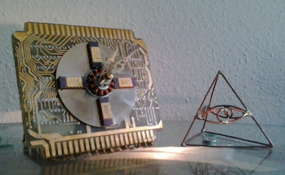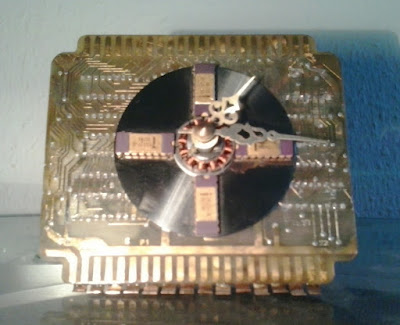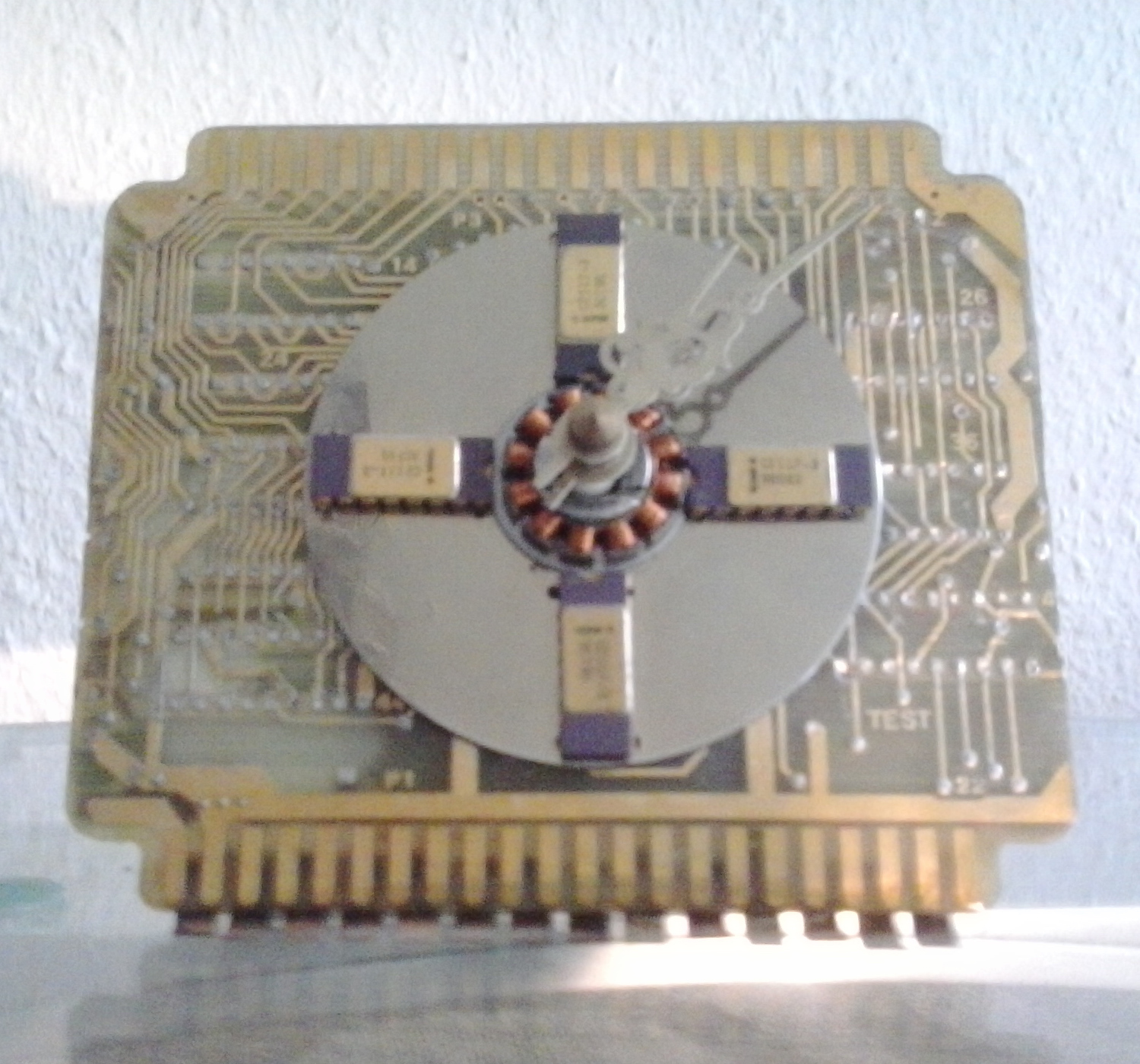 Diese Tischuhr wurde aus einer Einschubplatine für Elektrotechnische Steueranlagen erstellt und ist von mir mit einer Laptop-Festlattenscheibe, 4 IC's/Chips mit vergoldeter Metalloberfläche und ein Kupferblech als Fussteil ausgestattet worden.